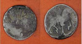 | Description / विवरण | Descrpn./Obv Recumbent bull facing left, wearing jhula (saddle cloth), with trisula (trident) symbol on rump. Above, legend in Sarada script Sri Samantadeva . Descrpn./Rev Rider with lance on caparisoned horse facing right. On left, Sarada letter bhi and on right, Sarada letter ta |