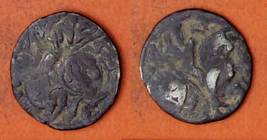 | Description / विवरण | Descrpn./Obv Recumbent bull facing left, wearing jhula (saddle cloth), with trisula (trident) symbol on rump. Above, legend in Sarada script Sri Samantadeva . Descrpn./Rev Rider with lance on caparisoned horse facing right. On left, Sarada letter bhi and on right, Sarada letter ta |