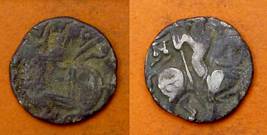 | Description / विवरण | Descrpn./Obv Recumbent bull facing left, wearing jhula (saddle cloth), with trisula (trident) symbol on rump. Above, legend in Sarada script Sri Samantadeva . Descrpn./Rev Rider with lance on caparisoned horse facing right. On left, Sarada letter bhi and on right, Sarada letter ta |
