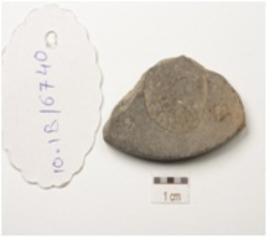 | Description / विवरण | Fragment of a terracotta coin mould, three individual circular coin mould visible on both surface with negative impression. |