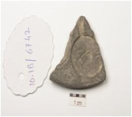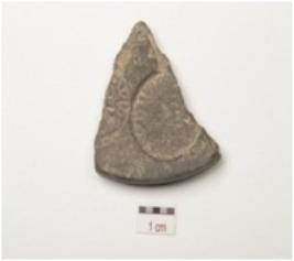 | Description / विवरण | Fragment of a terracotta coin mould, three individual circular coin mould visible on both surface with negative impression and channel going towards center. |