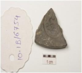 | Description / विवरण | Fragment of a terracotta coin mould, two individual circular coin mould visible on both surface with negative impression. |