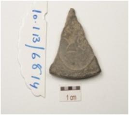 | Description / विवरण | Fragment of terracotta circular coin mould, three individual negative impressions partly visible on both the surface. |