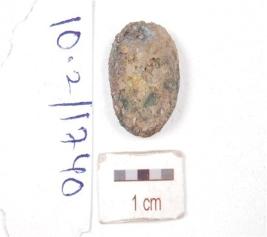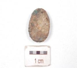 | Description / विवरण | A copper coin, irregular oval in shape, surface is corroded and weathered. |
