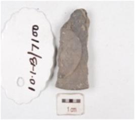 | Description / विवरण | Fragment of a terracotta mould, three individual circular coin mould partly visible on both the surface with negative impression of brahmi script on one side. |