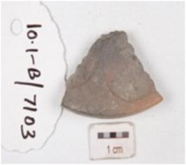 | Description / विवरण | Fragment of a terracotta mould, three individual circular coin mould partly visible on both the surfaces with negative impression of brahmi script on one side. |