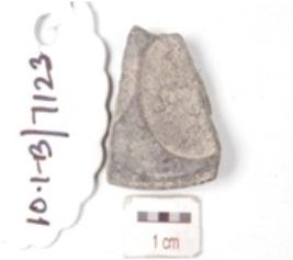 | Description / विवरण | Fragment of a terracotta coin mould, three individual circular coin moulds partly visible on both the surfaces with negative impression of brahmi script on one side. |