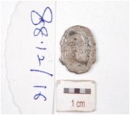 | Description / विवरण | A silver coin, round in shape having bust of king and punch mark over bust on obverse side, and on reverse side, having chaitya, tarnished surface and legend illigible. |