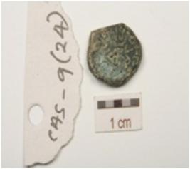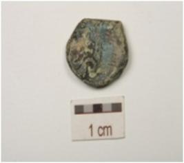 | Description / विवरण | A coin made of lead, irregular in shape, legend in brahmi on obverse side, symbols on reverse and pattination on the surface. |