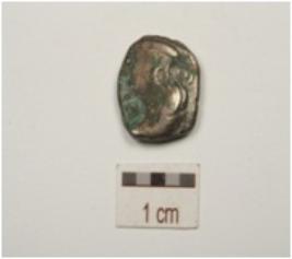 | Description / विवरण | A silver coin, circular in shape, bust of the king on obverse side, legend in brahmi on reverse side, pattination on the side with depiction of bust. |