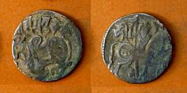 | Description / विवरण | Descrpn./Obv Recumbent bull facing left, wearing jhula (saddle cloth), with trisula (trident) symbol on rump. Above, legend in Sarada script Sri Samantadeva . Descrpn./Rev Rider with lance on caparisoned horse facing right. On left, Sarada letter bhi and on right, Sarada letter ta |