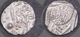 | Description / विवरण | Descrpn./Obv In the centre, a chhatra with Sa and Ta in Gurumukhi script on the left and right of its shaft; traces of the Persian legend seen on the obverse of the bigger Nanakshahi coins of Amritsar mint are also seen. Descrpn./Rev Big peepal leaf and traces of the Persian legend seen on the reverse of the bigger Nanakshahi coins of Amiritsar mint - Shri Amritsarjiv zarb [VS Year] Takht maimanat julus manus Akal Bakht. Especially traces of alif of Akal and te of Takht and maimanat are seen |
