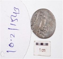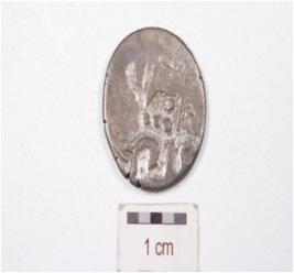 | Description / विवरण | A silver coin, round in shape, having human image on obverse side and indeterminate image on side, tarnished surface. |