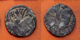 | Description / विवरण | Descrpn./Obv Recumbent bull facing left, wearing jhula (saddle cloth), with trisula (trident) symbol on rump. Above, legend in Sarada script Sri Samantadeva . Descrpn./Rev Rider with lance on caparisoned horse facing right. On left, Sarada letter bhi and on right, Sarada letter ta |