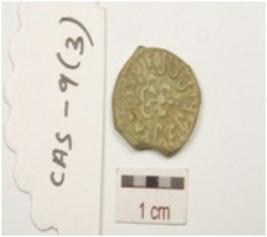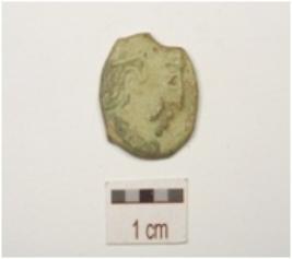 | Description / विवरण | A coin made of potin, irregular edges, bust of king on obverse, symbol of crab on reverse side with a legend in brahmi. |