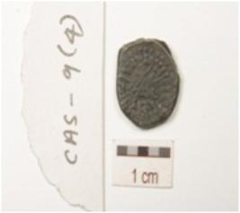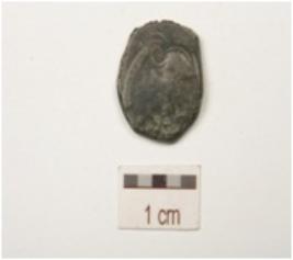 | Description / विवरण | A silver coin, irregular shape, bust of king on obverse legend and symbol on reverse symbols identified is three arched hill. |