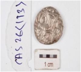 | Description / विवरण | A silver coin, circular in shape having indeterminate motif on both surface. |