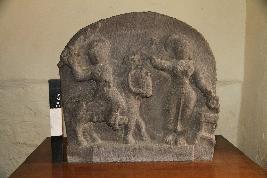 | Description / विवरण | Hero stone depicting a hero riding a horse. He holds a sword in his right hand in a raised position and the rope of the horse in his left hand. A dagger is shown on his waist. He has a hairstyle of a side bun. He is adorned with a lower garment and ornaments. The sword in his right hand is broken. In front of him is a standing female with a raised right hand and holding something in her left hand. The right hand is broken. She is portrayed with a coiffure of a side bun, adorned with ornaments and a lower garment. |