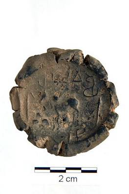 Description / विवरण | Round shape clay sealing depicted with standing bull figure. Two standards are depicted in both side of the figure. Below the figure legend 'Dhanadevasya' is written in gupta brahmi script. |