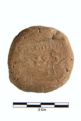 Description / विवरण | Round shape lump of clay with square shape stamp bearing the legend 'Bahttimitrasya' in gupta brahmi script. |