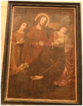 | Description / विवरण | Oil painting on wood, portrait showing Jesus Christ feeding ailing St. peter Canisus, attended by two angels, one of the angel holding a cup of holy medicine. |