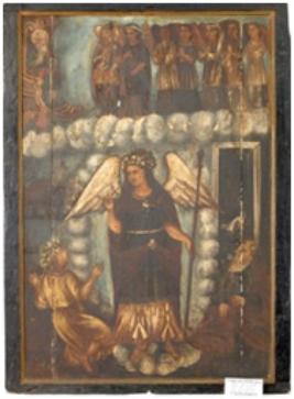 | Description / विवरण | Oil painting on wood, portrait showing god seated on a throne in heaven with seven angels and below the cloud St. Michael is passing his last judgement directing one person to her right to go to heaven while the other is going to hell. A dog is shown at the gate of the hell |