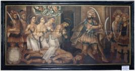 Oil painting on wood scene showing martyrdom of five fathers |