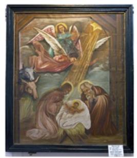 | Description / विवरण | Religious Painting on Canvas depicting birth of Christ s. Mother Mary gave Birth to her first born son and wrapped him in swaddling cloths and laid him in manger.Besides of Christ s His father and mother are seen.Some sparks are coming from a star .On the top portion two Angels are flying .Right side Cow s head and sheep s head also seen. |