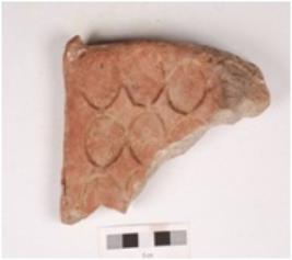| Description / विवरण | Fragment of a mould made terracotta tile with punch-impressions on the surface and three parallel lines along the edges. |