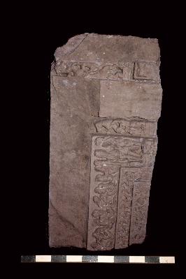 | Description / विवरण | The fragmentary door lintel with Sakhasbearing beautiful figurines of Vyala over an Elephant. The second one is plain. The fourth one depicts figures of Gandharavas dancing or playing music. The fifth Sakha is decorated with Nagapasha and the last one with floral designs. The last three panels are flanked by a standing figure of Lakshmi-Narayana in the right. |