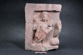 | Description / विवरण | Panel Fragment, probably depicting a Deity in standing posture with prominent facial features, surmounted by headdress, wearing Kundalas, necklace, very thin upper garment Utariyea and dhoti having rough surface. It is also holding a flower stick. |