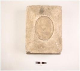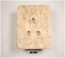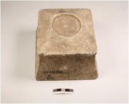 | Description / विवरण | A door base made of limestone, square shaped, tapering vertical sides, circular depression on upper side for fixing a lintel, three holes on lower surface for fixing on ground and polished surface. |
