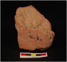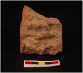 | Description / विवरण | Fragment of terracotta brick, square in shape grooved graphic design on surface. Edges are slightly chipped off and reverse side is broken, red in colour. |