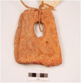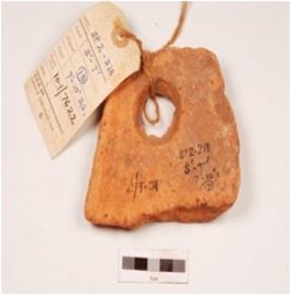 | Description / विवरण | Fragment of a roof tile, intact one end, damaged other end, flat with parallel sides, large perforated at one end, rough surface. |