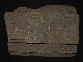 Fragment of an architectural part with some geometrical designs and some dancing figures on the edge.