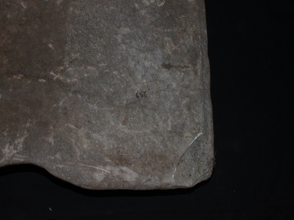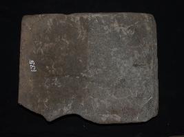 Carving expression faded due to high erosion, upper portion is lost, one corner on the back is broken.