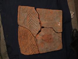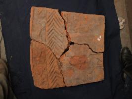 | Description / विवरण | It is a tile made by high quality clay. Colour is ochred and not well fired. Broken in the four part and birds figurine on it. Surface is rough and deposition of dust. |