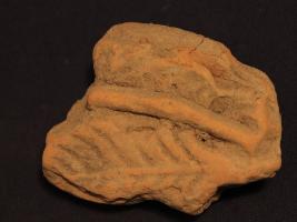 | Description / विवरण | It s a fragment of leaf made by terracotta. It is well fired and colour is ochred. Well decorated and broken from both sides. Rubbing on the surface and leaf design on it. |