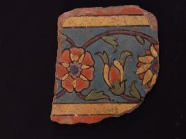 | Description / विवरण | It s a fragment of glazed tile made by high quality clay. It is well fired and colour is red, yellow. All sides are broken and flower design on it. Surface is rough and deposition of dust. |