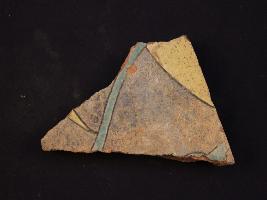 | Description / विवरण | It s a fragment of glazed tile made by high quality clay. It is well fired and colour is yellow, black. All sides are broken and leaf design on it. Surface is rough and deposition of dust. |