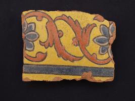 | Description / विवरण | It s a fragment of glazed tile made by terracotta with floral design on it. It is well fired and colours are red, blue and yellow. Broken from all sides. Rubbing on the surface. |