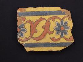 | Description / विवरण | It s a fragment of glazed tile made by terracotta with floral design on it. It is well fired and colours are red, blue and yellow. Broken from all sides. Rubbing on the surface. |