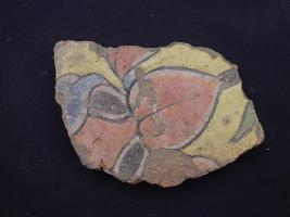 | Description / विवरण | It s a fragment of glazed tile made by terracotta with floral design on it. It is well fired and colours are red, blue, green, white and yellow. Broken from all sides. Rubbing on the surface. |