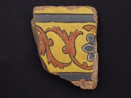 | Description / विवरण | It s a fragment of glazed tile made by terracotta with floral design on it. It is well fired and colours are red, blue and yellow. Broken from all sides. Rubbing on the surface. |