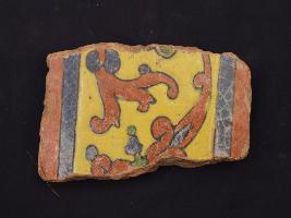 | Description / विवरण | It s a fragment of glazed tile made by terracotta with floral design on it. It is well fired and colours are red, blue, green and yellow. Broken from all sides. Rubbing on the surface. |