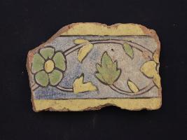 | Description / विवरण | It s a fragment of glazed tile made by terracotta with floral design on it. It is well fired and colours are blue, green and yellow. Broken from all sides. Rubbing on the surface. |