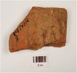 | Description / विवरण | A fragment of hand made rectangular decorated brick has incised vertical strokes within horizontal bands and floral design. |