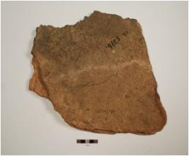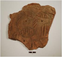 | Description / विवरण | Fragment of dull red, tile treated with red slip on upper surface and having incised intersecting circles with incised hatched and leaves other motifs, three holes made in between, ill fired and partly broken. |