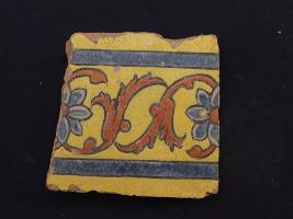 | Description / विवरण | It s a fragment of glazed tile made by terracotta with floral design on it. It is well fired and colours are red, blue and yellow. Broken from all sides. Rubbing on the surface. |