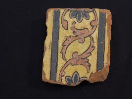 | Description / विवरण | It s a fragment of glazed tile made by terracotta with floral design on it. It is well fired and colours are red, blue and yellow. Broken from all sides. Rubbing on the surface. |